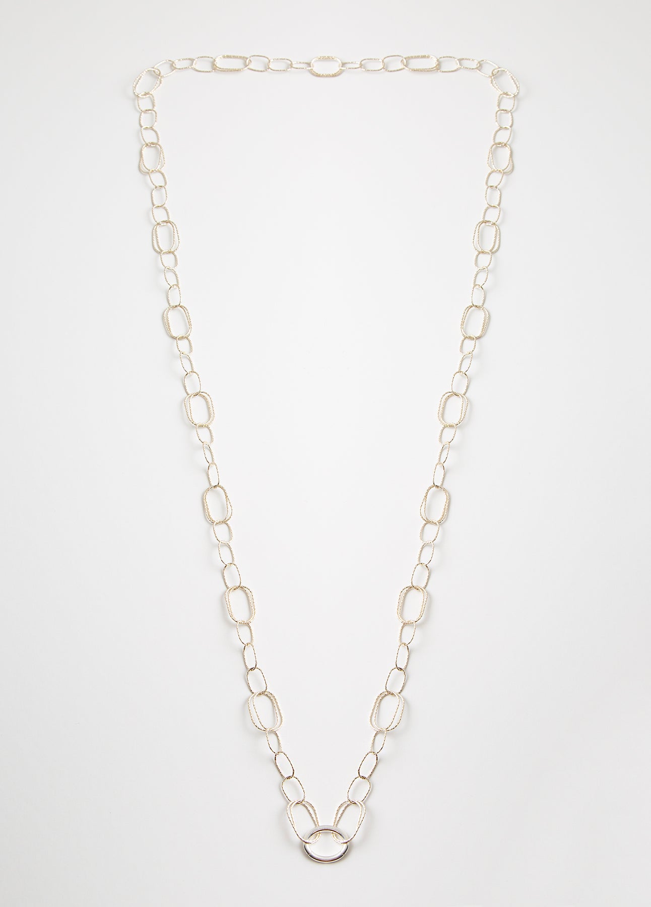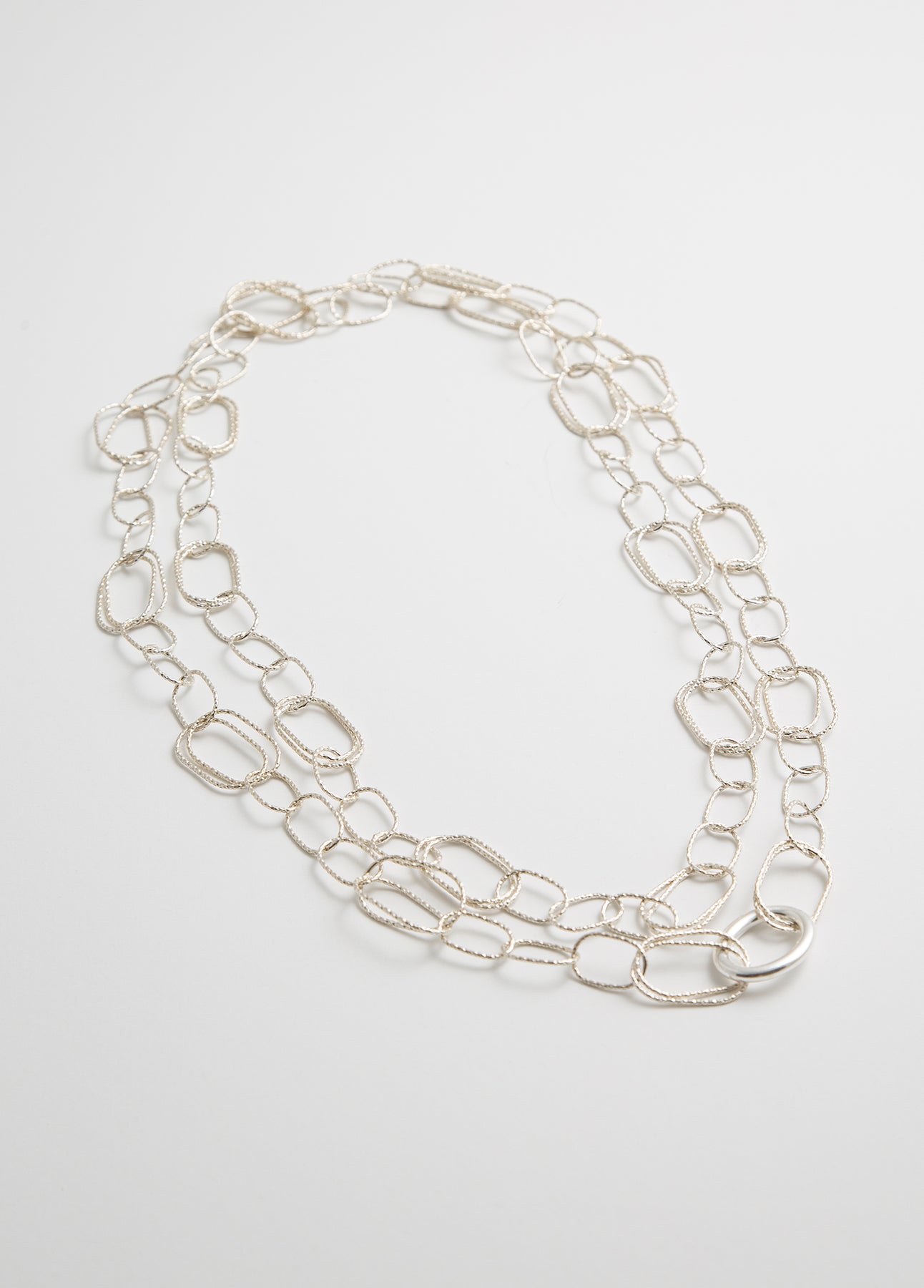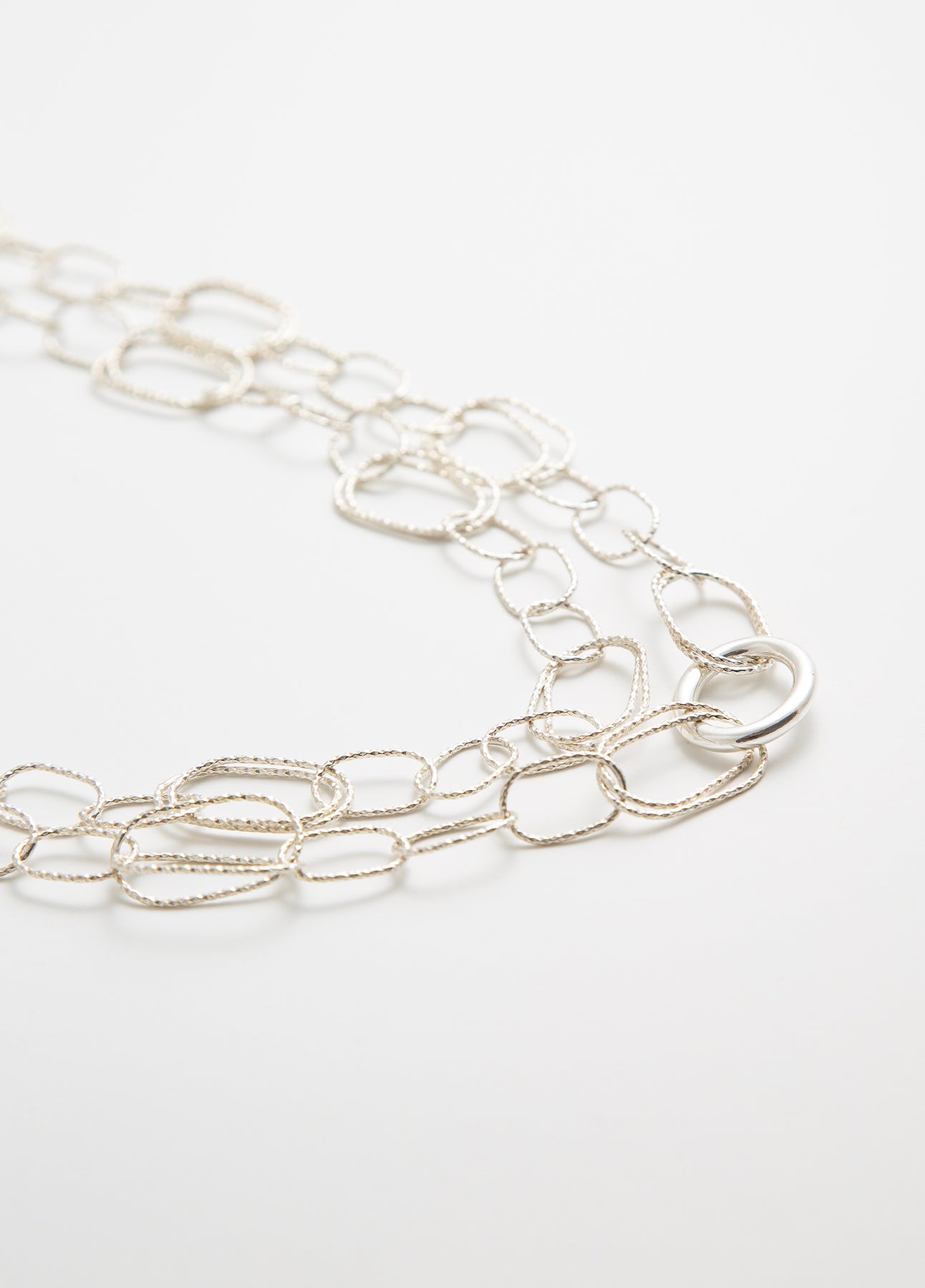 Crafted entirely from 925 sterling silver, its interlocking textured links create a modern, lightweight structure with a soft metallic shine.